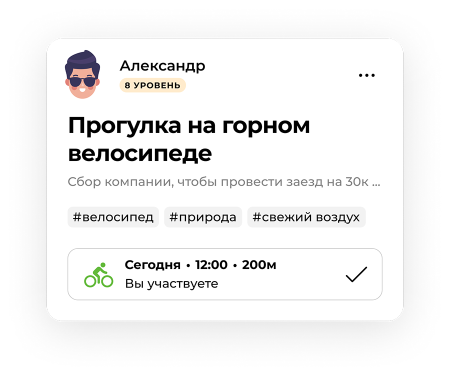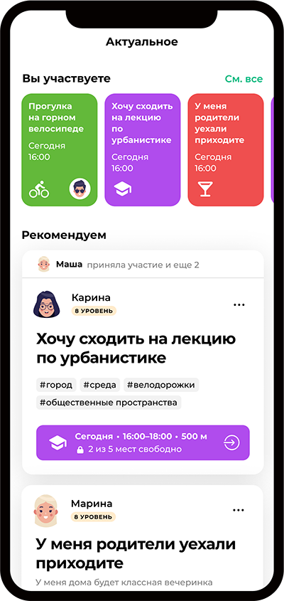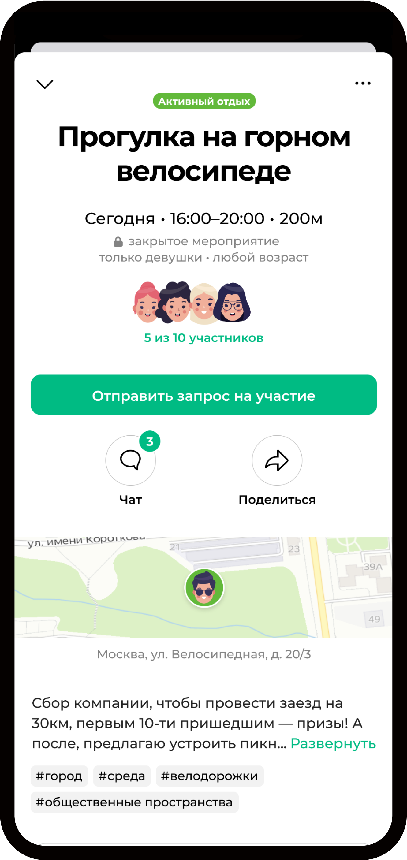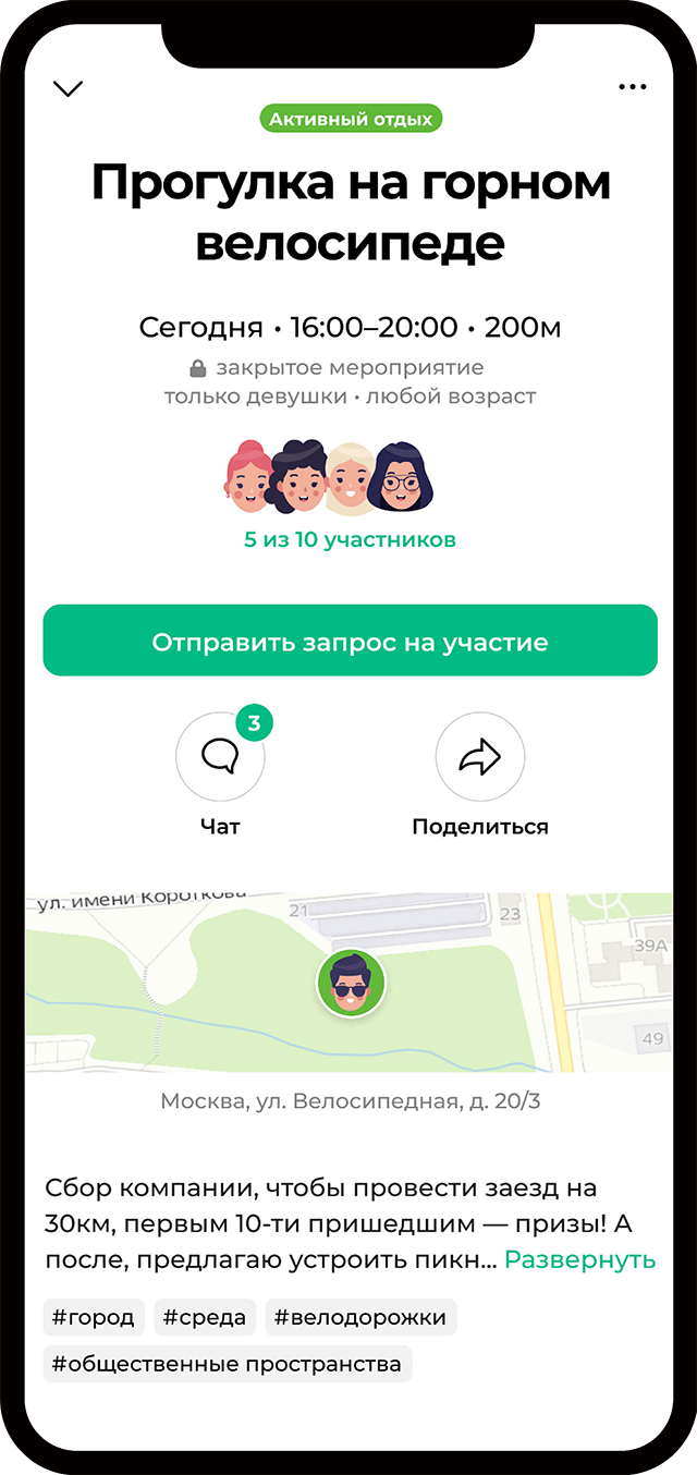В приложении вы легко найдете компанию для того, чтобы покататься на велосипеде в парке, пойти на концерт, каток и т.д.